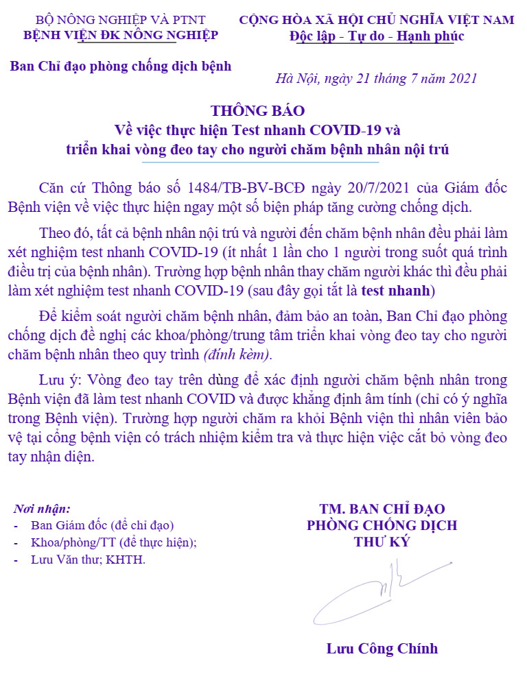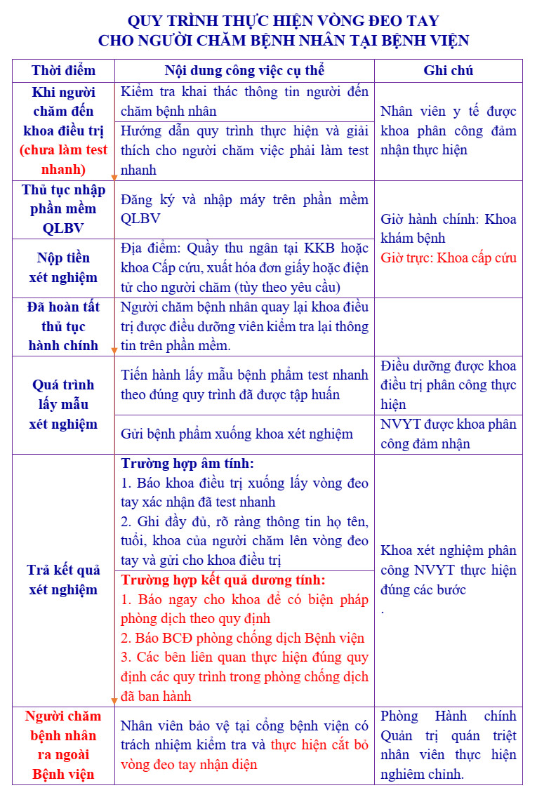 Cho đến nay, tất cả bệnh nhân nội trú và người đến chăm bệnh nhân đều phải xét nghiệm test nhanh Covid-19 (ít nhất 1 lần cho 1 người trong suốt quá trình điều trị của bệnh nhân). Trường hợp bệnh nhân thay người chăm khác thì đều phải làm xét nghiệm test nhanh Covid-19. Để kiểm soát người chăm bệnh nhân, đảm bảo an toàn, Bệnh viện triển khai vòng đeo tay cho người chăm bệnh nhân theo quy trình (đính kèm). Trường hợp người chăm ra khỏi Bệnh viện thì nhân viên bảo vệ tại cổng bệnh viện có trách nhiệm kiểm tra và thực hiện việc cắt bỏ vòng đeo tay nhận diện.