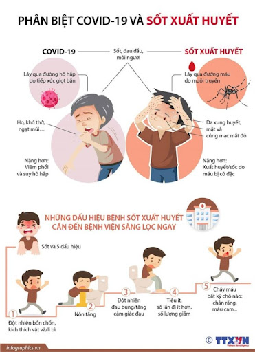 COVID-19 và sốt xuất huyết đều là những bệnh truyền nhiễm nguy hiểm gây ra bởi virus. Bệnh COVID-19 do virus SARS-CoV-2 gây ra, chủ yếu lây truyền từ người sang người qua các giọt bắn đường hô hấp lây lan khi người bệnh ho, hắt hơi hoặc nói chuyện, tiếp xúc gần… Còn sốt xuất huyết do 1 trong 4 chủng virus dengue gây ra, chủ yếu lây truyền sang người qua vết đốt của muỗi loài Aedes bị nhiễm bệnh.