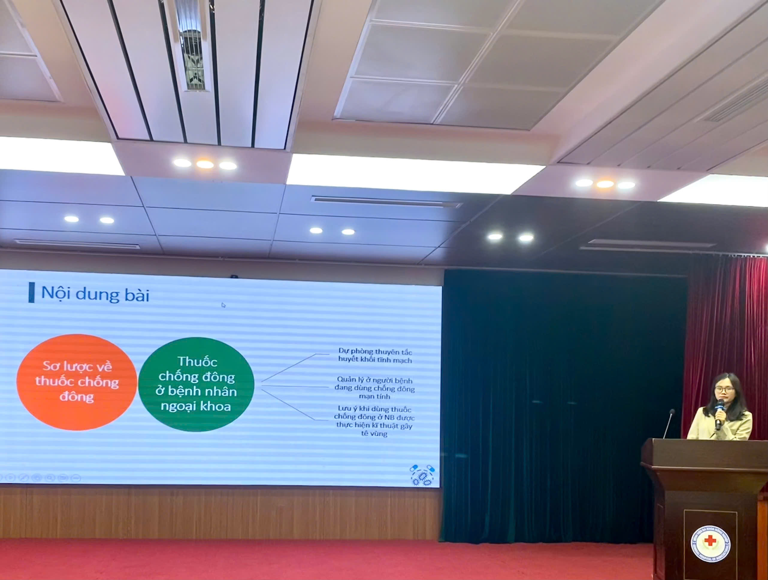 Buổi hội thảo có 2 bài báo cáo, bài đầu với chủ đề “Dược Lâm sàng trong sử dụng thuốc chống đông hợp lý, hiệu quả, an toàn ở bệnh nhân ngoại khoa” của NCS.ThS Nguyễn Thị Thu Thủy. Thuốc chống đông là nhóm thuốc có vai trò quan trọng trong phòng ngừa và điều trị huyết khối, đặc biệt ở bệnh nhân ngoại khoa. Các thuốc này tác động lên quá trình đông máu nhằm ngăn ngừa hình thành hoặc lan rộng cục máu đông, bao gồm thuốc chống đông máu, thuốc tiêu sợi huyết và thuốc chống kết tập tiểu cầu. Do thuộc nhóm thuốc nguy cơ cao, việc chỉ định và quản lý thuốc chống đông cần được thực hiện thận trọng và chính xác.