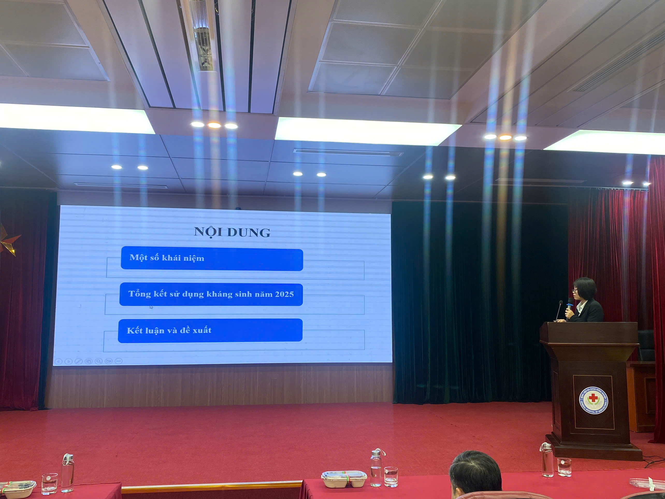 ThS.DS Lê Thị Thu trình bày bài “Tổng kết sử dụng kháng sinh tại Bệnh viện Đa khoa Nông nghiệp năm 2025”