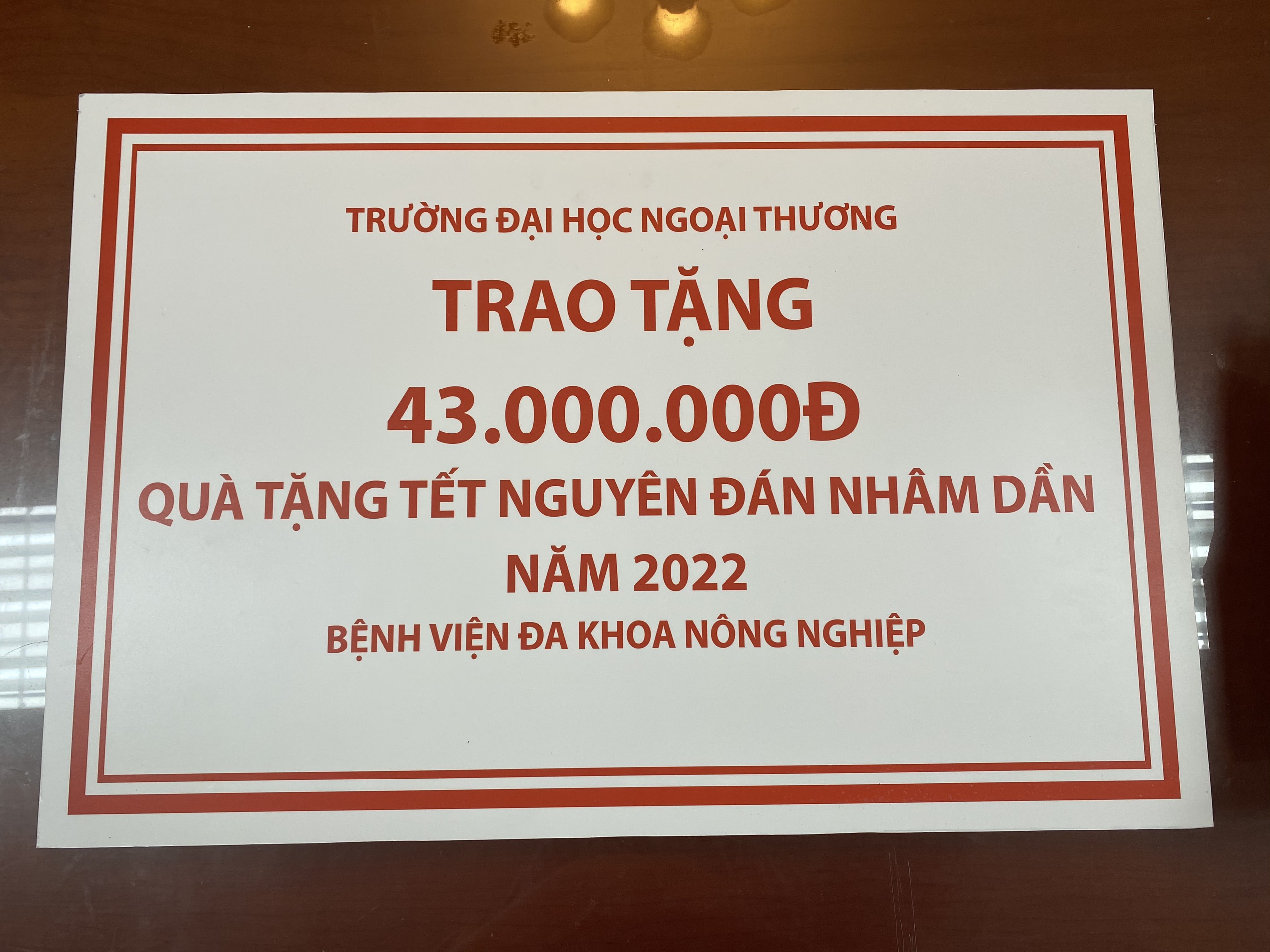 Tham dự và phát biểu tại chương trình đầy ý nghĩa nhân văn này, chia sẻ: Với mong muốn mang đến sự quan tâm cũng như chia sẻ phần nào khó khăn với các bệnh nhân, nhân viên y tế phải điều trị, đón Tết tại bệnh viện, hôm nay, chúng tôi thay mặt Ban Lãnh đạo, Ban Chấp hành Công đoàn Trường Đại học Ngoại Thương mang đến những phần quà nhỏ hi vọng có thể giúp các bác yên tâm điều trị, vơi bớt nỗi nhớ gia đình. Nhân dịp Xuân Nhâm Dần đang đến gần, cho phép tôi xin được kính chúc toàn thể Ban Lãnh đạo cũng như các y bác sĩ và các bệnh nhân tại Bệnh viện thật nhiều sức khoẻ, nhiều niềm vui và đạt được nhiều thành công trong cuộc sống.
